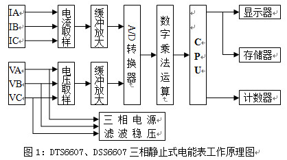 DTS6607、DSS6607型三相靜止式電能表(biǎo)工作(zuò)原理(lǐ)如圖1所示。
