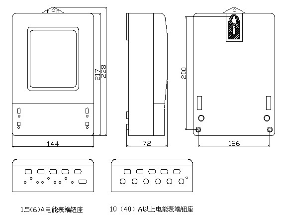 5.2電表上部有掛鉤螺釘孔,用M4掛鉤螺釘固定,電表下部有2個(gè)安(ān)裝孔用(yòng)M4X10或M4X12普通螺釘固(gù)定(dìng)在接線板上。電能表的(de)安裝、尺寸如圖下: