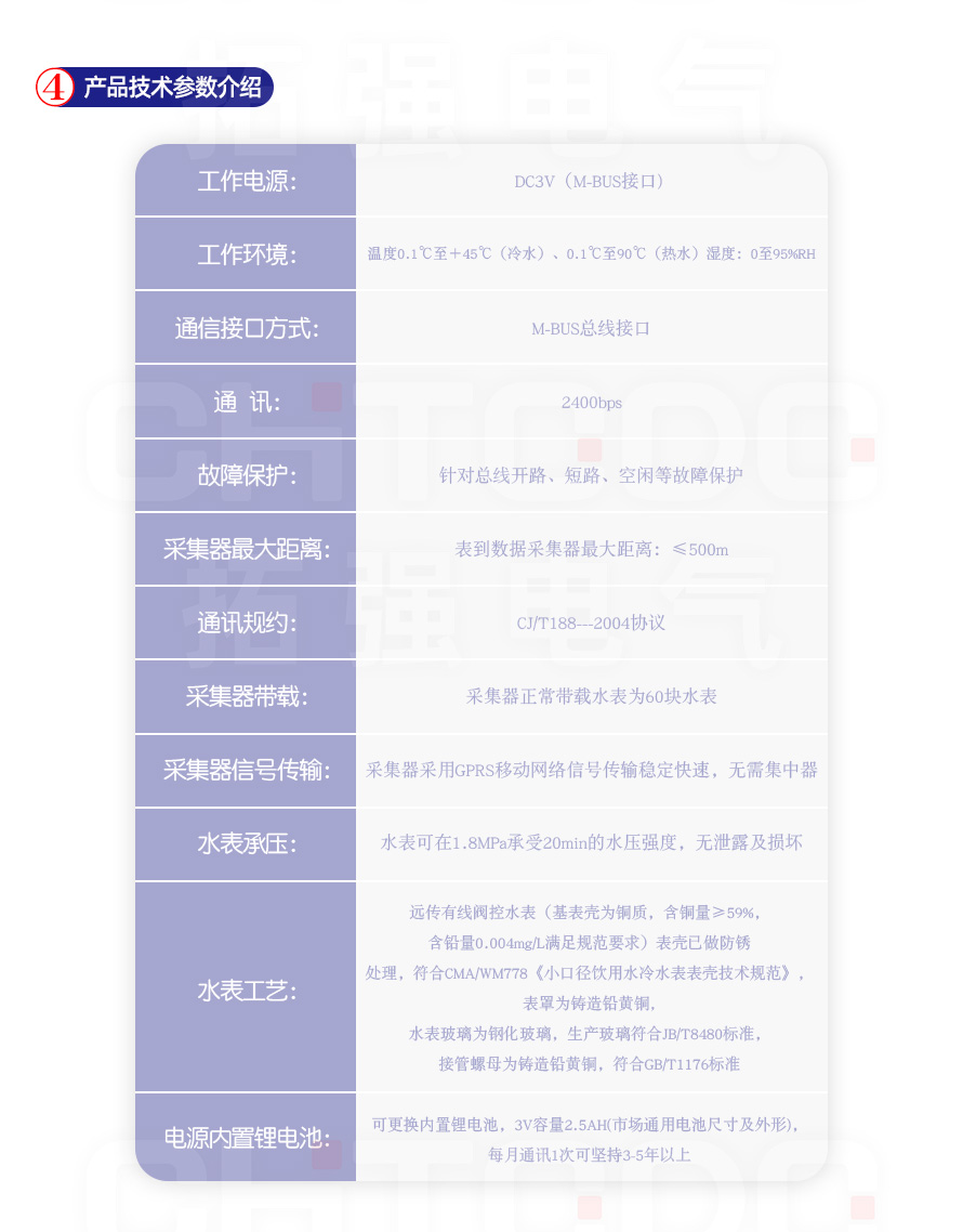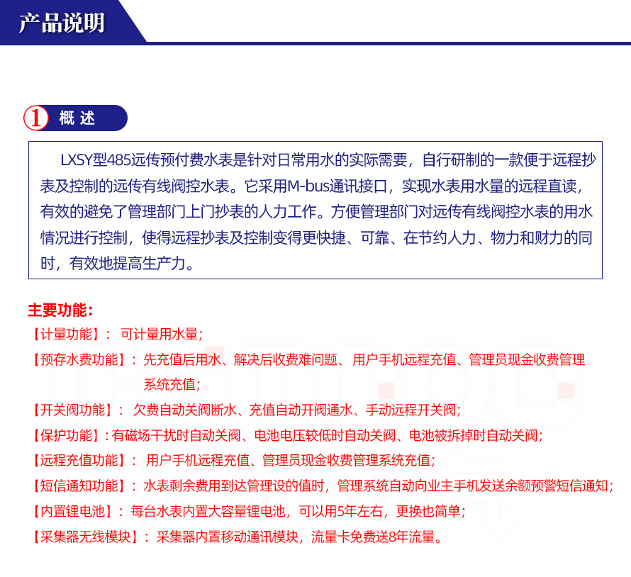-遠傳水表采用(yòng)絕對編(biān)碼方式和M-BUS通訊方(fāng)式,信號(hào)傳輸(shū)穩定,無需外接電源通讀時需要的電流直接由M-BUS總線提供,抄表方式快捷,數據更準確(què)、可靠。