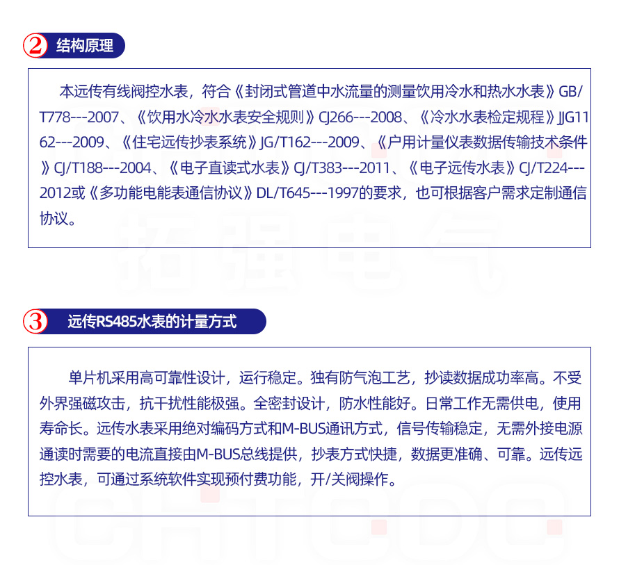 本遠傳(chuán)有(yǒu)線閥(fá)控水表,符合《封閉式管道中水流量的測量 飲用冷水和(hé)熱水(shuǐ)水表》GB/T778---2007、《飲用水冷水(shuǐ)水表安全規則》CJ266---2008、《冷水水表檢定規程》JJG1162---2009、《住宅遠傳抄(chāo)表係統》JG/T162---2009、《戶用計量儀表數據傳輸技術條件(jiàn)》CJ/T188---2004、《電子直(zhí)讀式水表》CJ/T383---2011、《電子遠(yuǎn)傳水表》CJ/T224---2012或《多功能電能表通信協議》DL/T645---1997的要求,也可根據客戶需求定製通信協議。